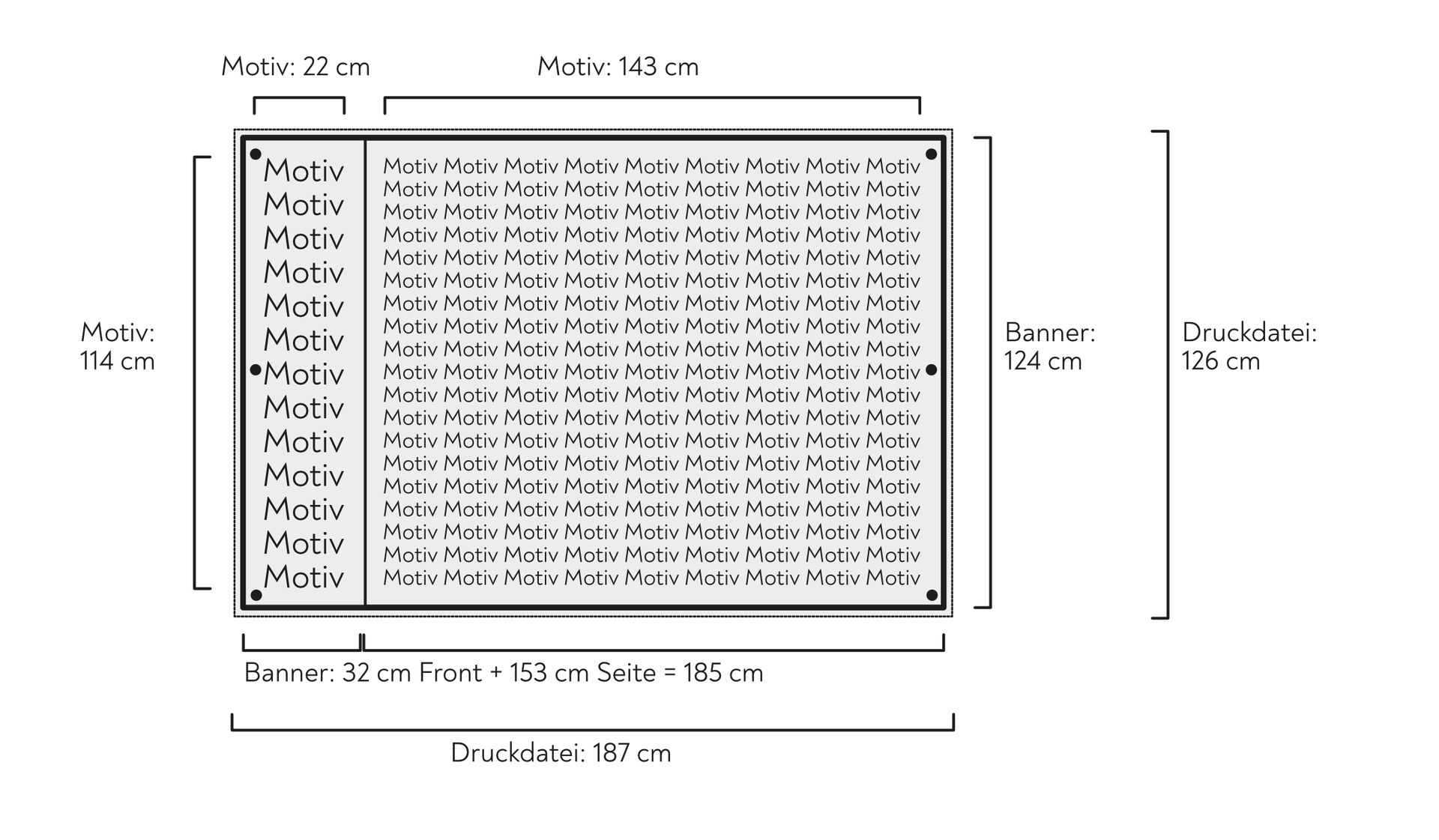 Soll das gesamte Banner bespielt werden inklusive der kleinen Frontfläche, kann die Druckdatei bereits komplett erstellt werden mit diesen Anforderungen: